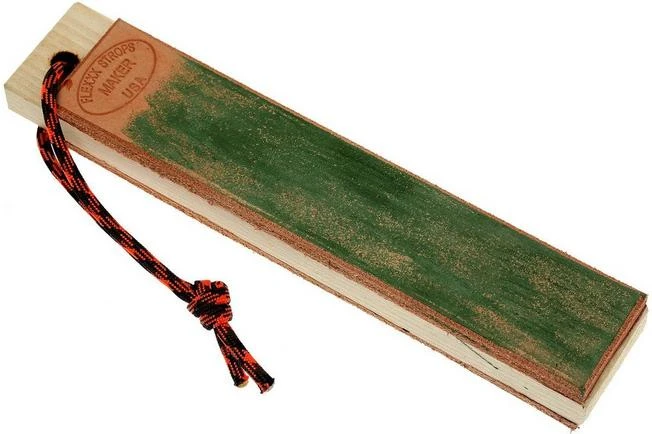 The FLEXXX STROPS Signature Field strop is compact and flexible, suitable for nearly all knives. The total size of the strop is small, but the usable surface to strop on is relatively large. The leather used is thick and its surface is pretty smooth. Because the leather is attached onto wood the stropping surface stays straight. The strop is delivered “pre-loaded”. This means that one side already equipped with black compound (grit 3000), where the other side has green compound (6000). So you can get started right away!