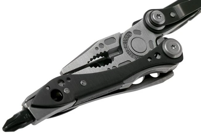 bitholder, bottle opener, knife, pliers, screwdriver, wire cutter, carabiner