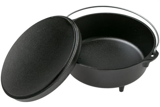This Lodge Dutch Oven (shallow) with lid can do it all. Use it on the stove, in the oven, or over an open flame. You can stack hot coals on top of the lid, or turn the lid over and use it as a baking dish. For high heat simply place the pan on top of hot coals. Because of the feet it will always be at the right height. Do you prefer slow cooking? If so hang the pan over an open flame using a tripod! The cast-iron retains the heat well and perfectly distributes it.