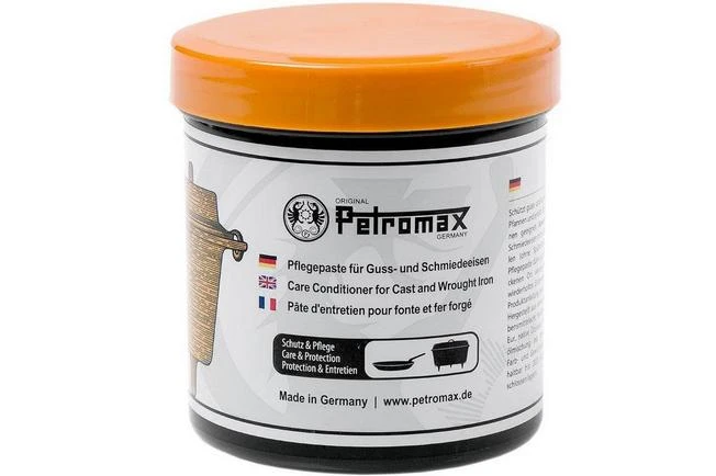 With the Petromax Care and Seasoning Conditioner cleaning and maintaining your cast-iron pans and kitchen tools will be a piece of cake. The conditioner is made from natural ingredients and protects the treated surface of Petromax Dutch Ovens and other cast-iron kitchen tools from rust. In addition, the conditioner is also great to season untreated Dutch Ovens. Frequently using this conditioner will optimize the cooking functions of your cast-iron pan.