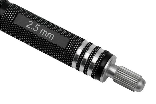 The TSPROF Hex Screwdriver 2.5 mm is a solid Allen key with a size of 2.5 mm. The handle is made from aluminium and has a diameter of 1.8 cm. You adjust the total length of the screwdrivers by loosening the screw in the handle, pushing the rod down and securing the screw again. The screwdriver is adjustable from a minimum length of 10 cm to a maximum length of 19.5 cm.