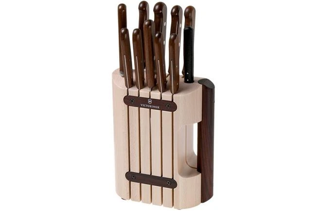 The Victorinox 5.1150.11, 11-piece knife set is a complete knife set. The 8 kitchen knives are accompanied by a meat fork, a potato peeler and a honing steel to make sure everything stays nice and sharp. Multi-functional, natural and stylish. With this knife set you will have the right tool for every task in the kitchen.