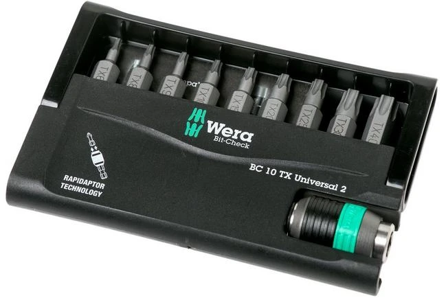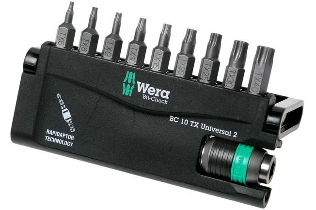 The Wera Bit-Check 10 Torx universal 10-piece Torx Set 5057115001 is a set with 10 different Torx screwdrivers in a compact and well-organized set that even fits inside your pocket. The set uses a 6.35 mm (1/4″) connection. Indispensable for technicians, opticians, precision engineers, watchmakers, jewellers, hardware mechanics, model makers and of course for those who want to maintain their own knives and other tools.