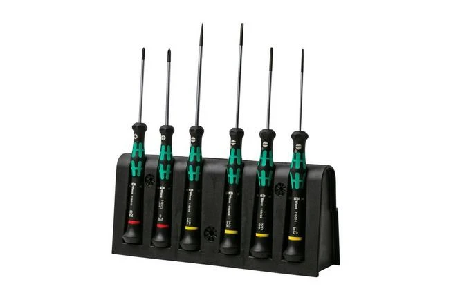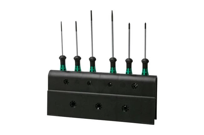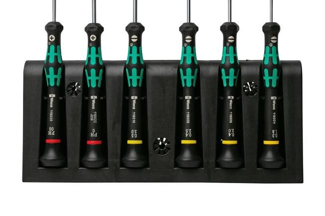 The Wera Kraftform Micro 6-piece screwdriver set with holder, 5118150001 is a set of six small screwdrivers and a holder you can use to organize your screwdrivers. Indispensable for technicians, opticians, precision engineers, watchmakers, jewellers, hardware mechanics, model makers and of course for those who want to maintain their own knives and other tools.